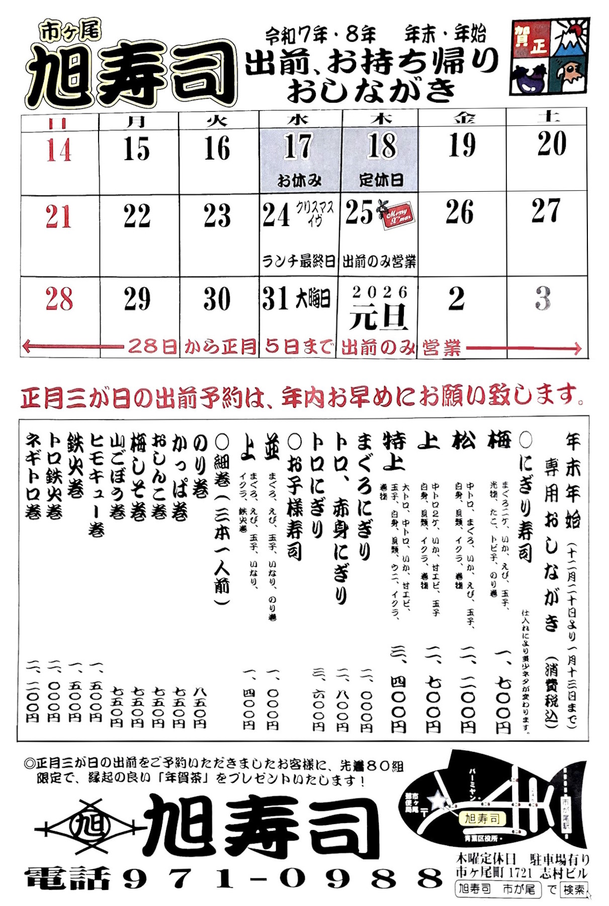 誠に勝手ながら、都合により15日(月曜).16日(火曜)は臨時休業とさせて頂きます。 皆様のご健康を祈りつつ、旭寿司のご… 続きはこちら →